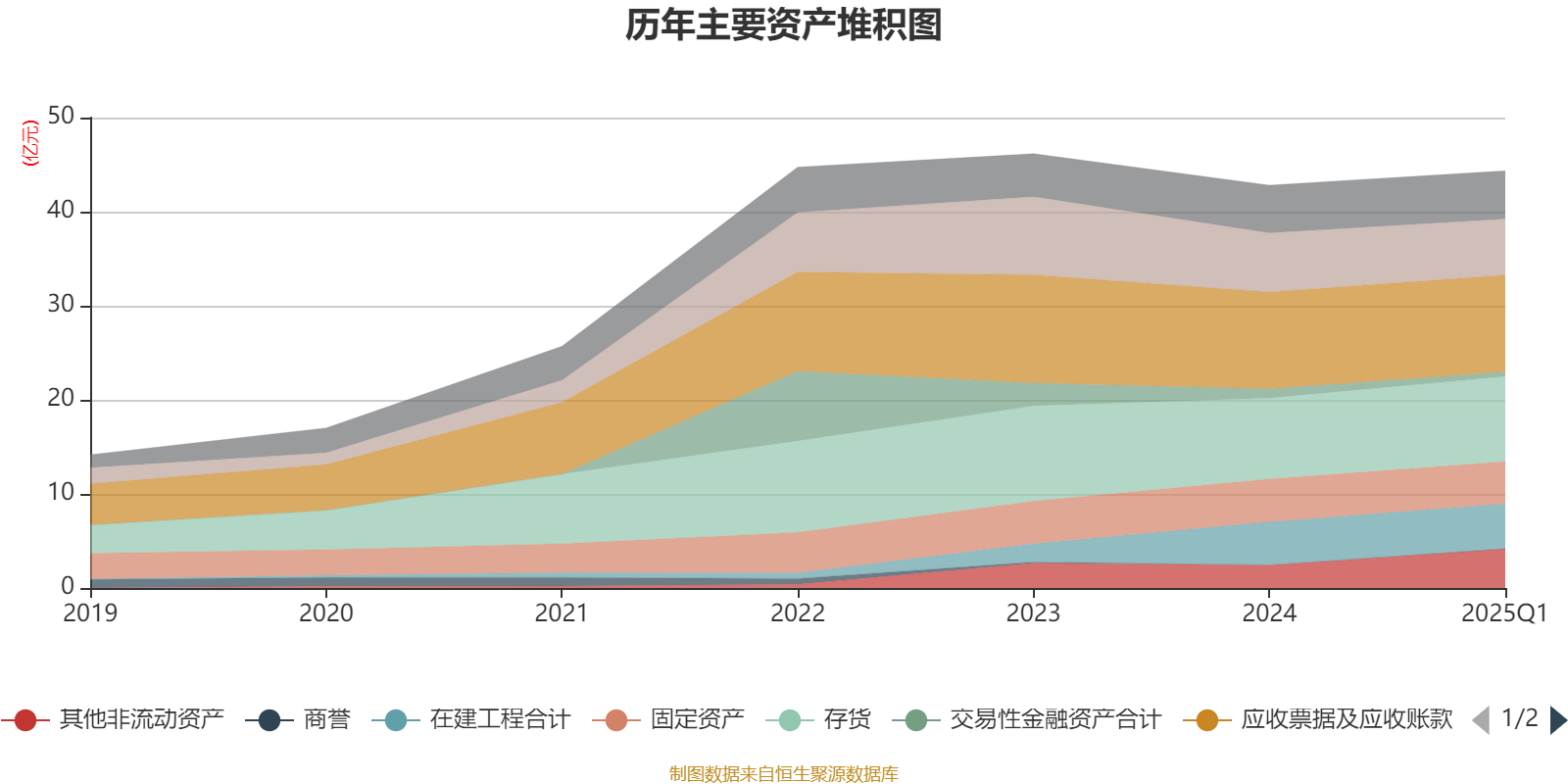 资产重大变化方面,截至2025年一季度末,公司其他非流动资产较上年末增加71.09%,占公司总资产比重上升3.7个百分点;货币资金较上年末减少5.19%,占公司总资产比重下降1.24个百分点;交易性金融资产合计较上年末减少50.15%,占公司总资产比重下降1.22个百分点;应收票据及应收账款较上年末增加0.16%,占公司总资产比重下降0.79个百分点。