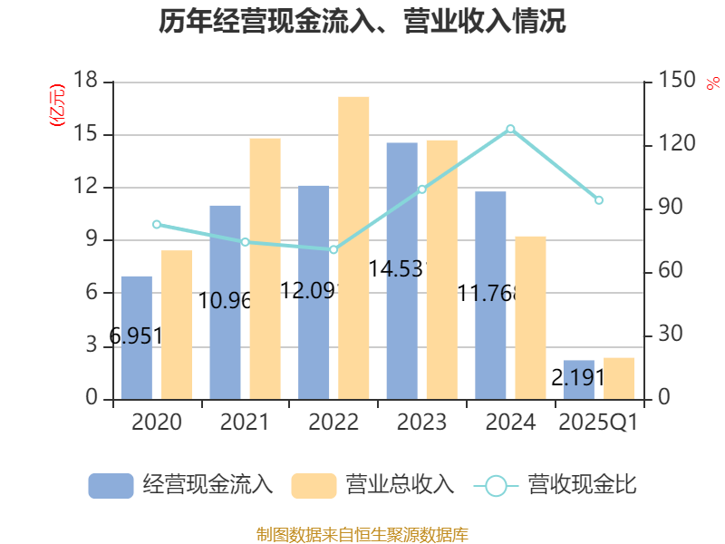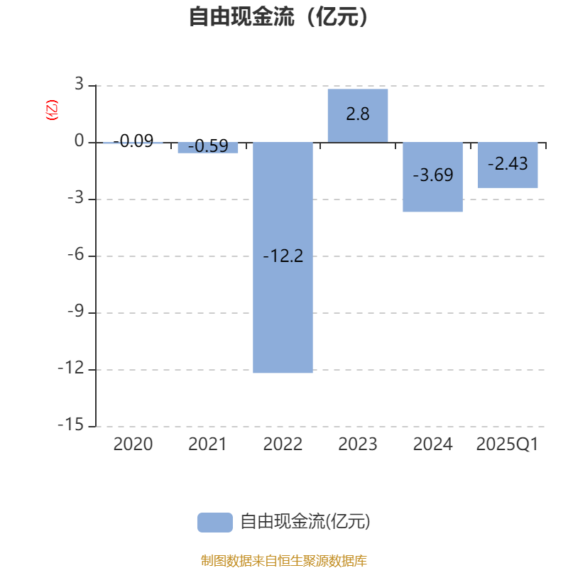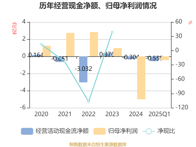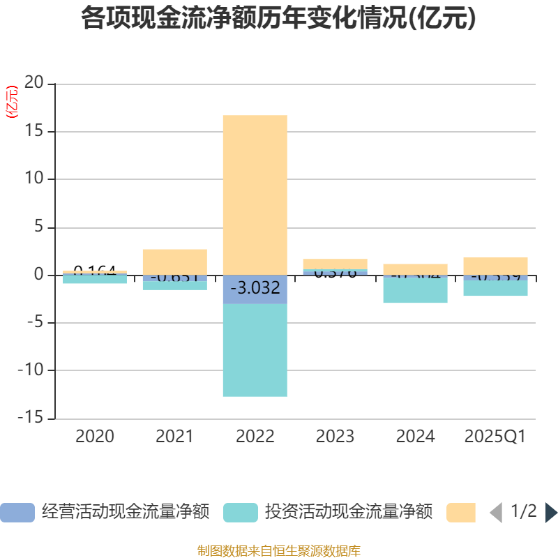 截至2025年一季度末,公司经营活动现金流净额为-5588.41万元,同比减少6853.74万元;筹资活动现金流净额1.85亿元,同比增加2.07亿元;投资活动现金流净额-1.61亿元,上年同期为1971.4万元。